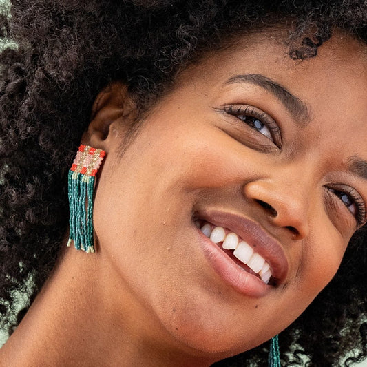 Ava Crossing Colorblock Beaded Fringe Earrings Teal + Poppy